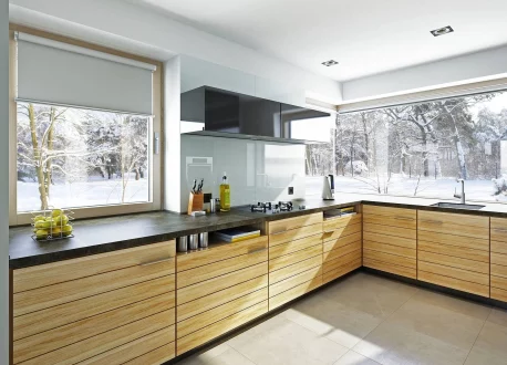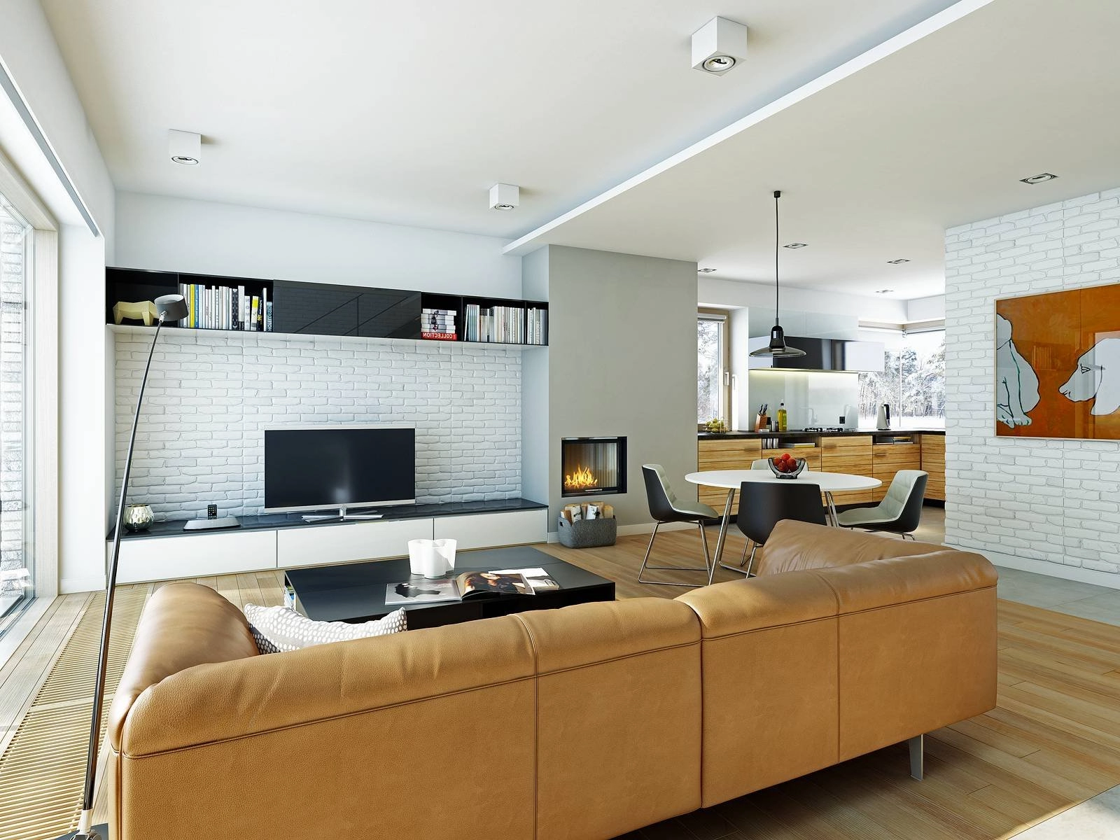 Nowoczesny projekt małego domu z elewacją klinkierową i dachem bezokapowym. Druga wersja tej interesującej rodziny projektowej charakteryzuje się mniejszą powierzchnią użytkową i wymiarami zewnętrznymi, ale podobnym wyglądem podkreślonym ponadczasową i trwałą elewacją klinkierową. Nowoczesna forma budynku uległa drobnym modyfikacjom, m.in. otrzymała dwa podcienie: wejściowy i ogrodowy przy gabinecie. Wariant „2” pomimo mniejszych gabarytów zyskał w układzie wnętrza garderobę przy wejściu oraz spiżarnię przy kuchni.