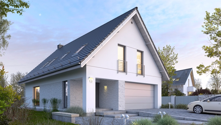To kolejna wersja w rodzinie projektów Dostępnych wyróżniająca się dużym jednostanowiskowym garażem. Podobnie jak pozostałe dwa warianty również i ten posiada bardzo funkcjonalny program pomieszczeń w ramach niewielkiej powierzchni użytkowej. Poza garażem na dwa auta głównym atutem projektu są 4 wygodne sypialnie na piętrze, w tym sypialnia rodziców z oddzielną garderobą. To idealny projekt przeznaczony dla 3-4 osobowej rodziny dysponującej niedużą działką, poszukującej domu wygodnego i niedrogiego w budowie. Dzięki niewielkim gabarytom oraz rozwiązaniom energooszczędnym, takim jak wentylacja mechaniczna w standardzie, budynek charakteryzuje się również niskimi kosztami eksploatacji.